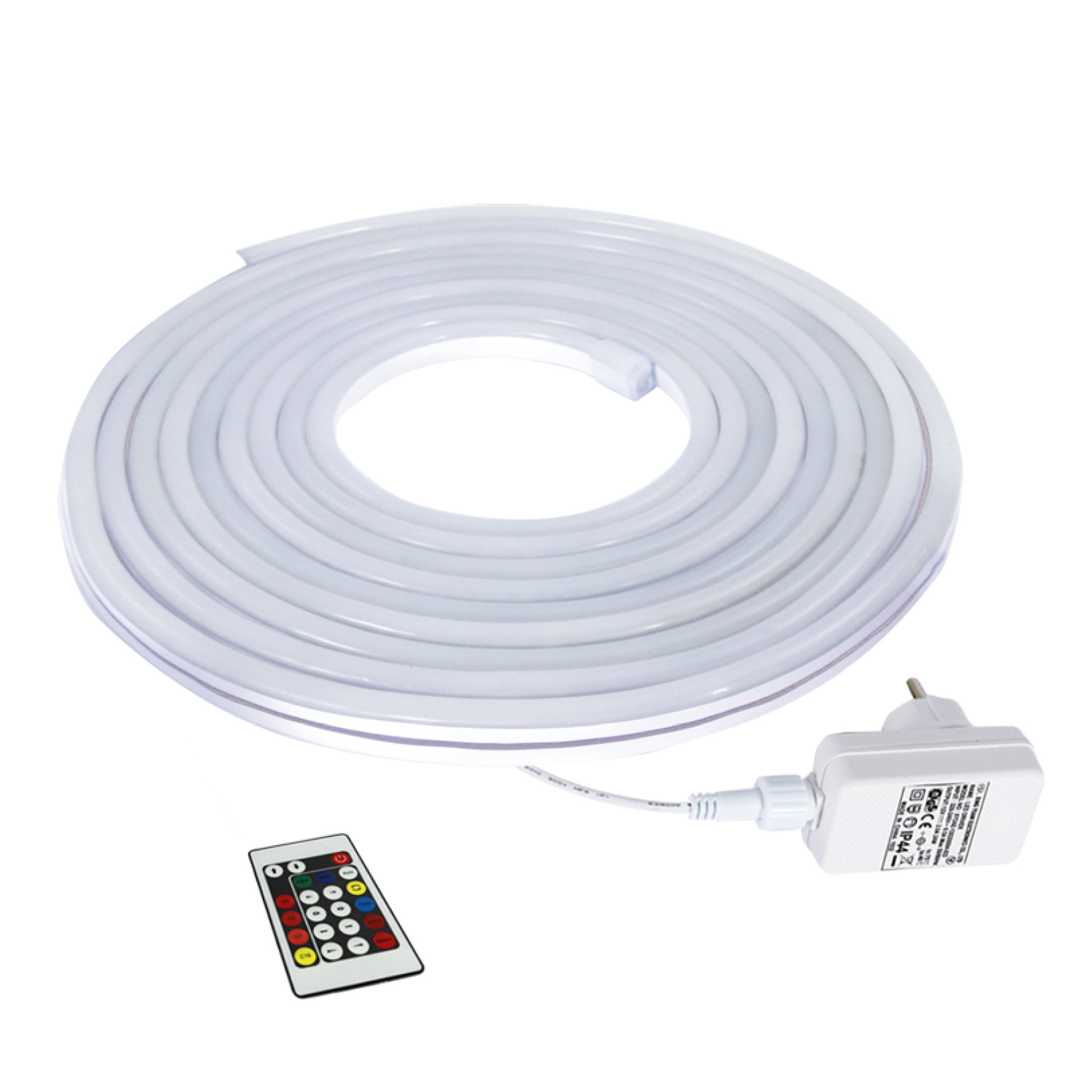 Use the remote control to adjust the desired neon color of the stripe or set it to change colors automatically. A power adapter and a 5 m remote control are included in the package.